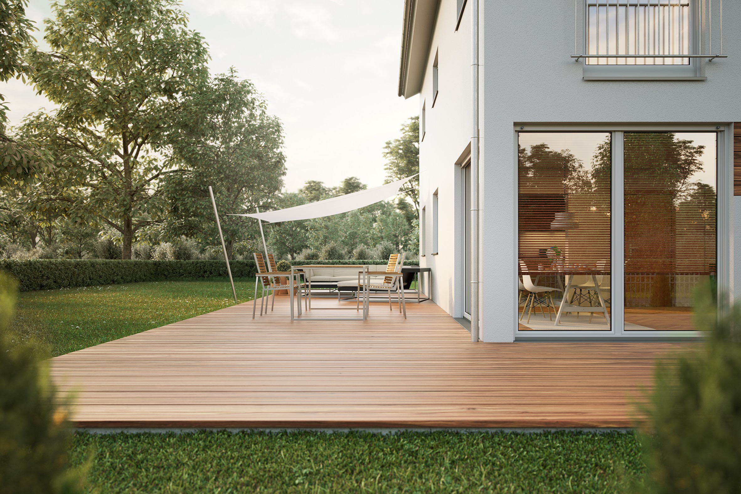 Modernes Wohnen auf zwei Ebenen. Dabei sorgen die großen Fenster für lichtdurchflutete Zimmer in Ihrem neuen Traumhaus.
